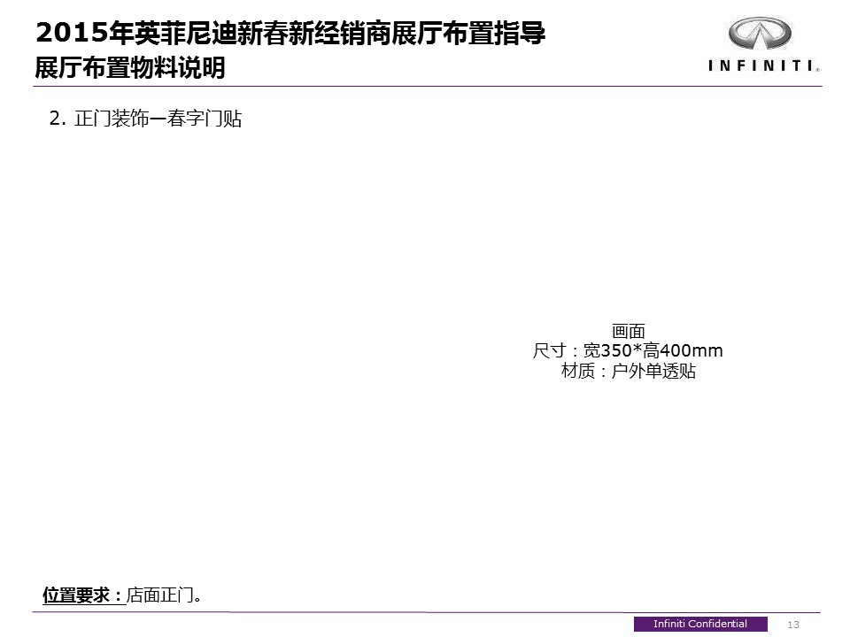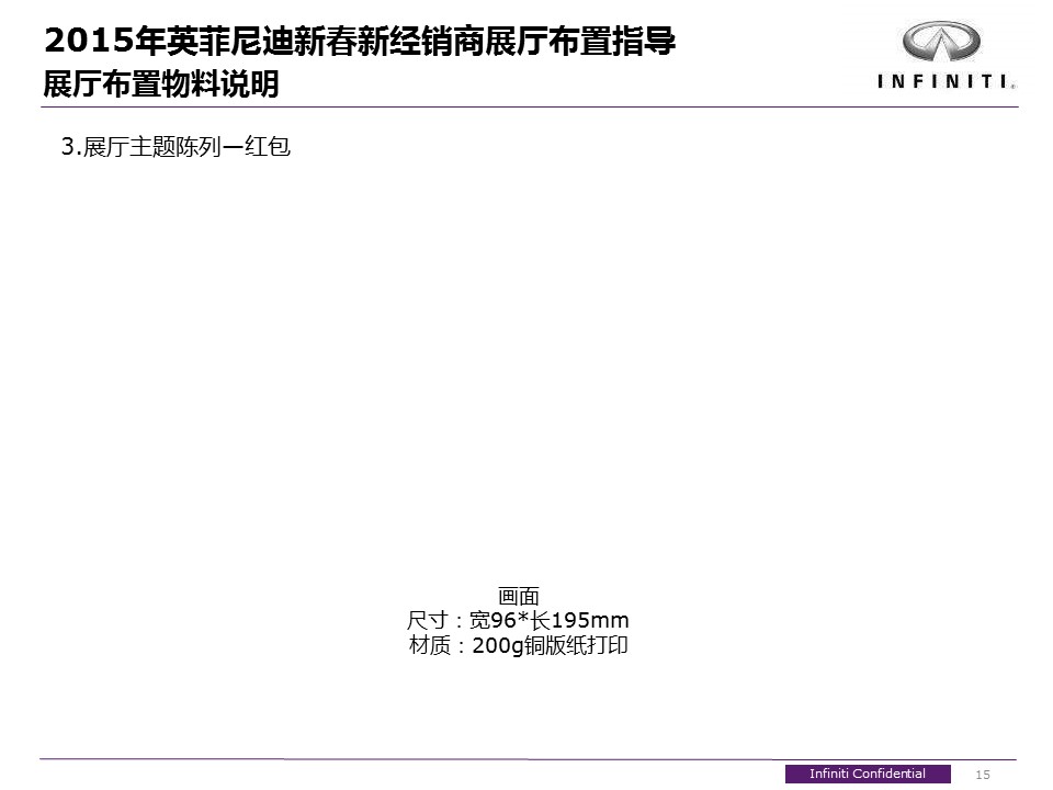 海案网签约策划师* *,于23天前发布了一份不限年份的作品《2015年英菲尼迪新春新经销商展厅布置指导_0113》,本案例包含了策划方案等相关内容,案例行业为不限行业,有12人浏览了此作品,0 人给予好评! 更多优秀作品免费下载请搜索营销策划案例作品。