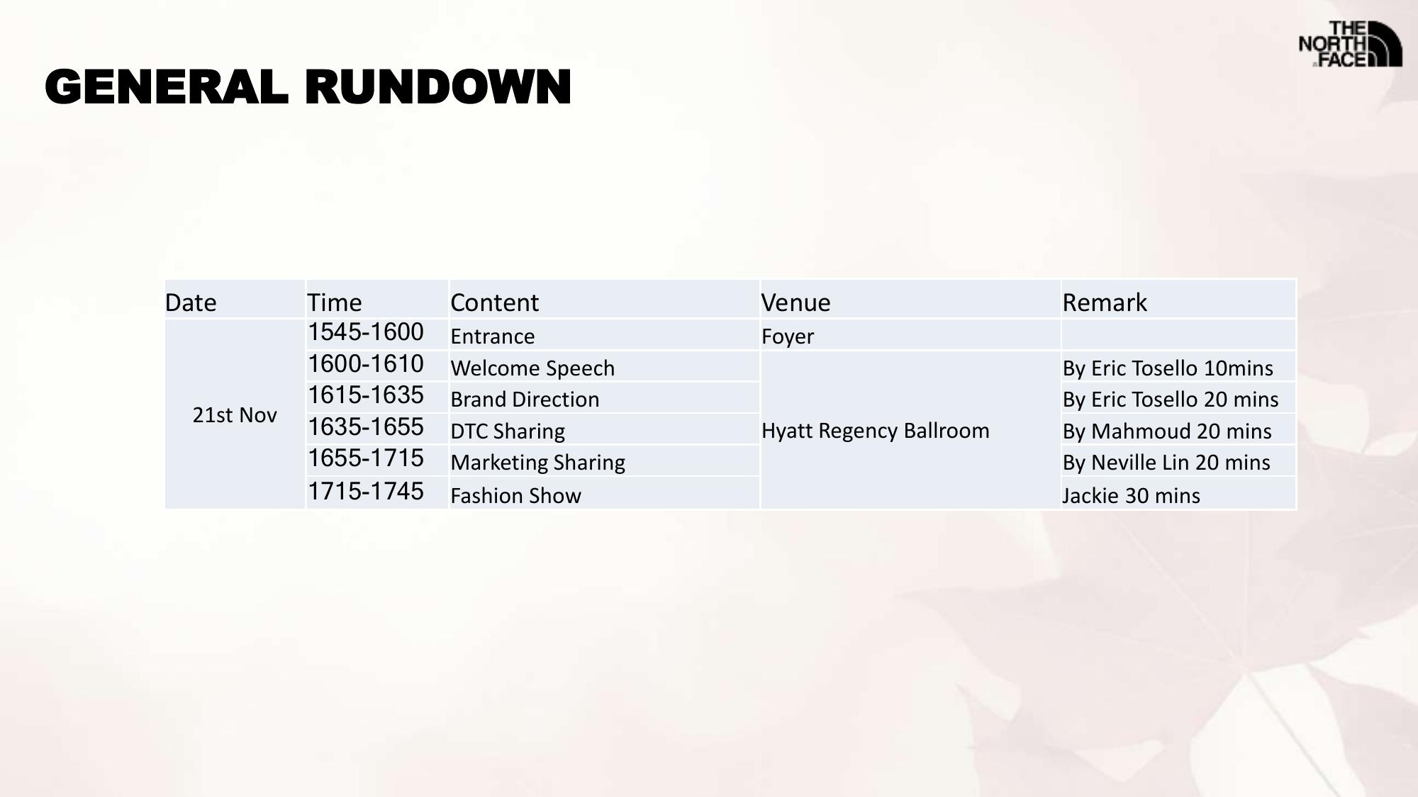 海案网签约策划师* *,于1月前发布了一份不限年份的作品《TNF FW18 Sales Meeting 最终版执行方案20171116》,本案例包含了策划方案等相关内容,案例行业为不限行业,有10人浏览了此作品,0 人给予好评! 更多优秀作品免费下载请搜索营销策划案例作品。