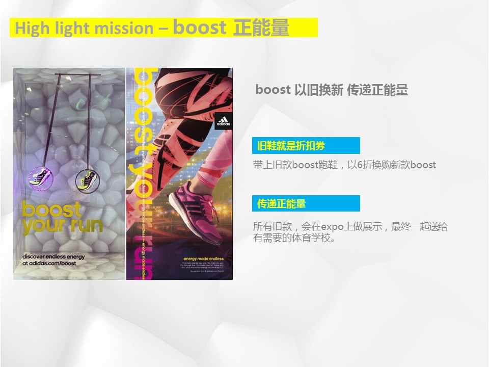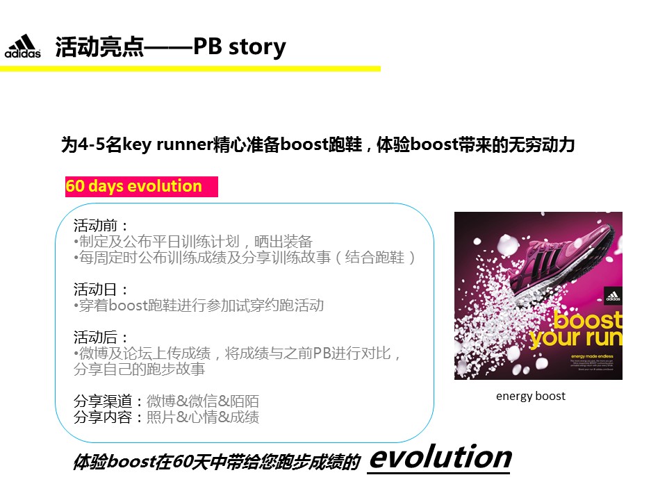 海案网签约策划师* *,于29天前发布了一份不限年份的作品《运动品牌boost运动鞋 14FW 2nd 推广方案》,本案例包含了策划方案等相关内容,案例行业为不限行业,有10人浏览了此作品,0 人给予好评! 更多优秀作品免费下载请搜索媒体推广方案策划方案、品牌推广方案策划方案、餐饮营销推广方案策划方案、sem推广方案策划方案、汽车推广方案策划方案、营销策划案例作品。
